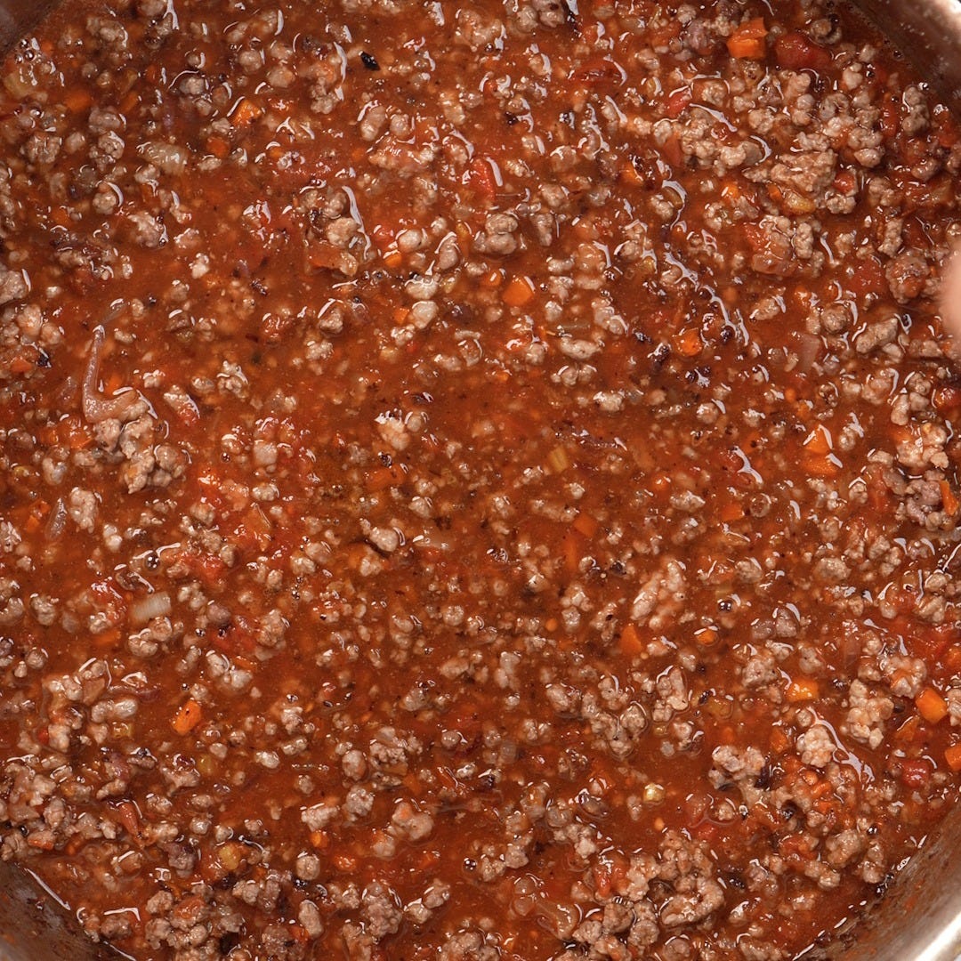 For the ragù, start with a soffritto of carrot, celery, and onion in butter and olive oil. Remove the vegetables and keep them aside. In the same pan, brown the beef and pork well. Deglaze with a splash of red wine, then add tomato paste, passata, broth, and the reserved vegetables. Simmer gently for 1½ hours, stirring sometimes. Add the milk at the end to round the flavor.