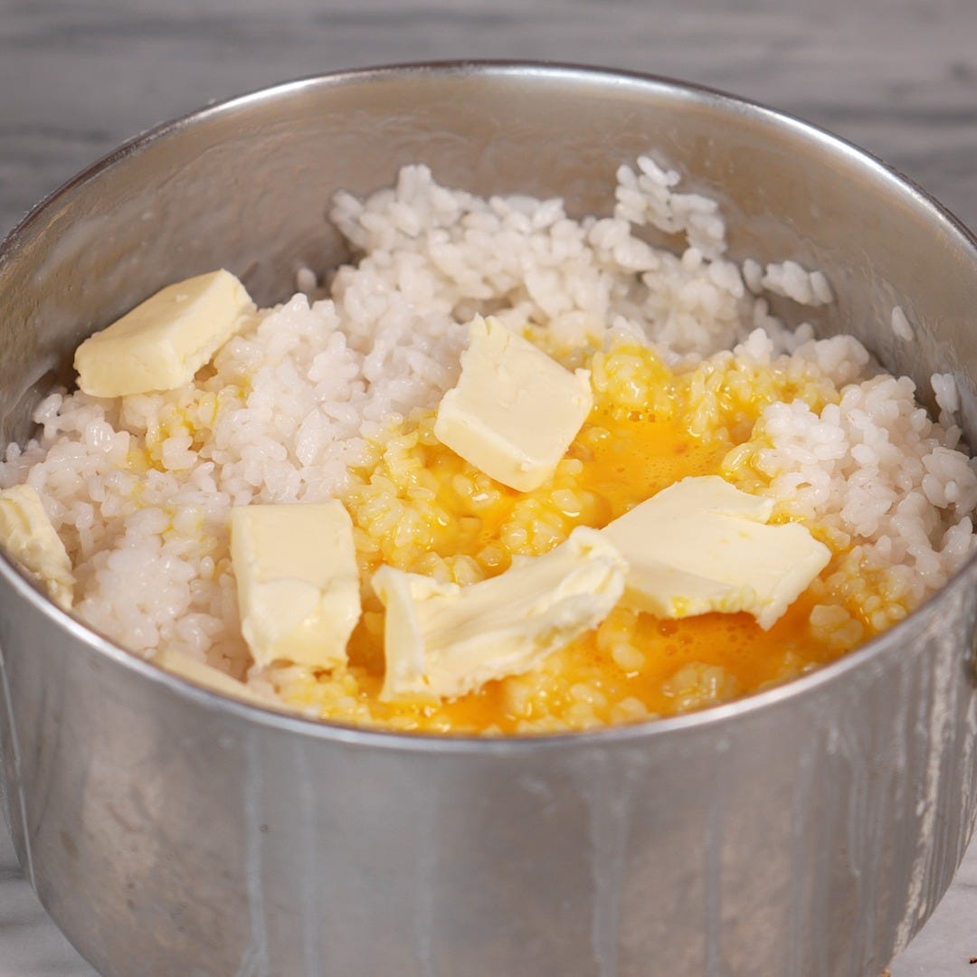 Cook the rice in salted water with saffron until all the liquid is gone, about 14 minutes. Keep the heat steady and stir now and then so it doesn’t stick. When done, mix in butter, grated cheese, and eggs while still warm. Spread it on a tray to cool, so it firms up.