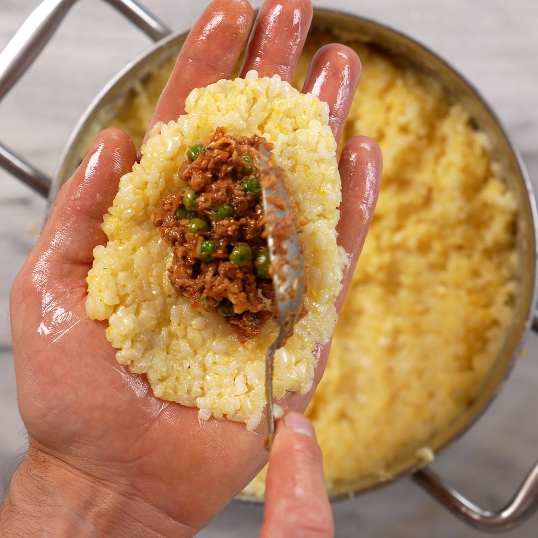 I can say by experience that what makes arancini special isn’t just the crisp shell: it’s how every part has a job. The rice needs to rest and firm up wile the eggs act like glue; the double breading keeps everything sealed. A slow thick ragù gives you a filling that’s rich but never runny so once you get all those pieces right, you’ll hear that quiet crackle and know it’s working.